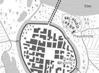 Rekonstruktion Historischer Stadtplan der civitas Dresden um 1216 in: Monstadt-Barthier, Heinze u.a.: Dresdner Kreuzkirche - Die Stadtkirche am Altmarkt, 2016